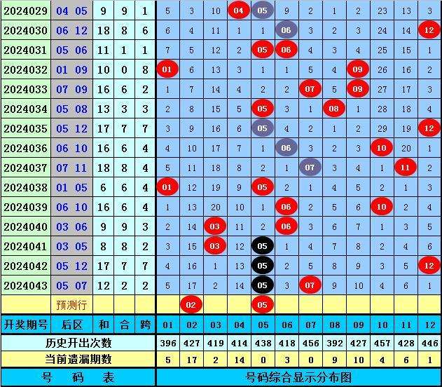 后区分析:上期后区奖号为05和07,最近5期后区和值分别为16、9、8、17、12,后区跨度分布范围在2-7,本期后区注意两码02、05。