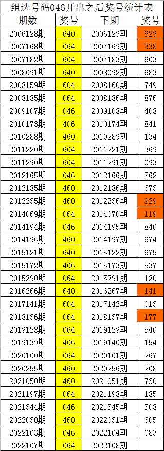 体彩排列三组选号码046历史上出现了33次,其下期奖号分别为:929、338、903、983、749、876、408、841、134、369、093、862、673、929、119、840、974、675、537、120、141、013、177、540、154、267、208、730、185、508、605、083,详细统计见下表: