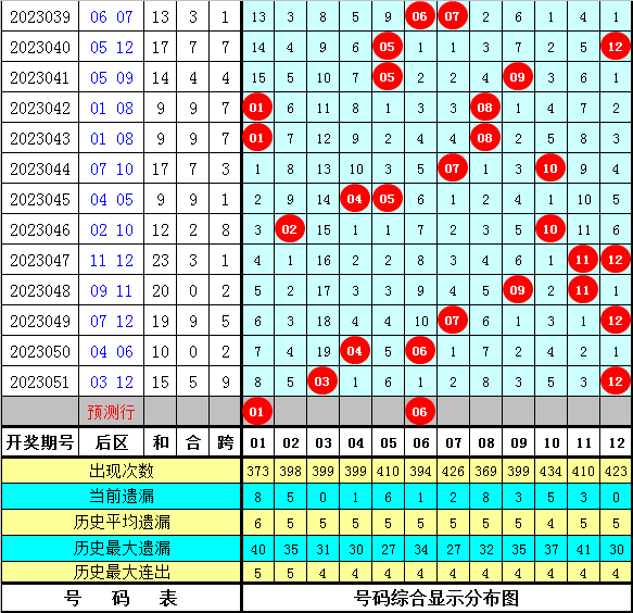 二、后区预测:后区上期开出号码03、12,为冷码+热码,目前后区号码遗漏值都在11以内,没有冷码,其中03、04、06、07、09、11、12为热码,01、02、05、08、10为温码,本期看好温码+热码组合出现,两码关注01、06。