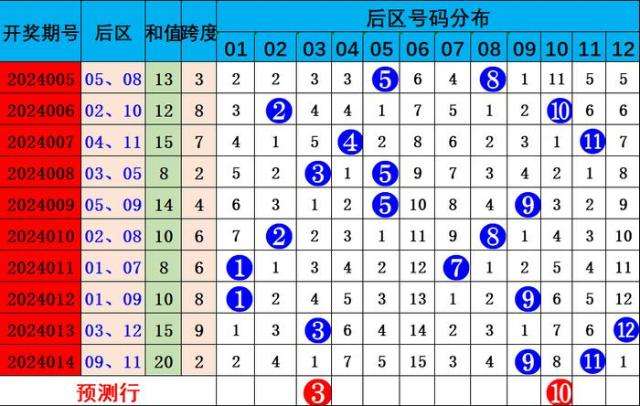 014期开出后区号码:09 11,热冷组合。冷热分析:近十期,冷热比7:13,冷号出号较冷,综合分析,本期预测热冷组合后区回补,关注号码03 05 07 08 10。精准推荐:03 10。