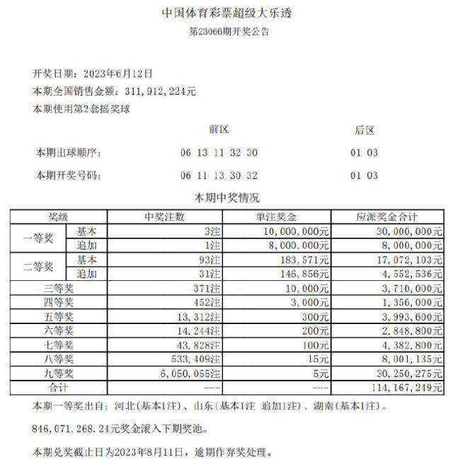 北京时间6月12日晚,体彩大乐透第23066期开奖,当期开奖号码为:前区06 11 13 30 32,后区01 03。