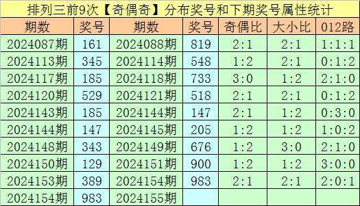 上期回顾:排列三第2024154期开出奖号983,类型为:奇偶奇、020路和大大小。