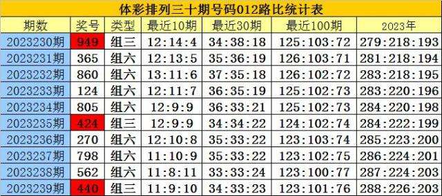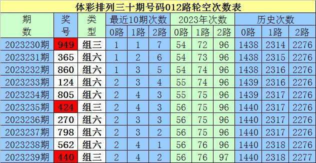 开奖回顾:排列三第2023239期奖号为:440,号码012路比为1:2:0。