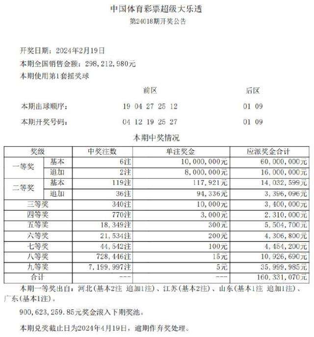 北京时间2月19日晚,体彩大乐透第24018期开奖,当期开奖号码为:前区04 12 19 25 27,后区01 09;本期全国销量为2。98亿元,计奖结束后奖池余额9亿元。