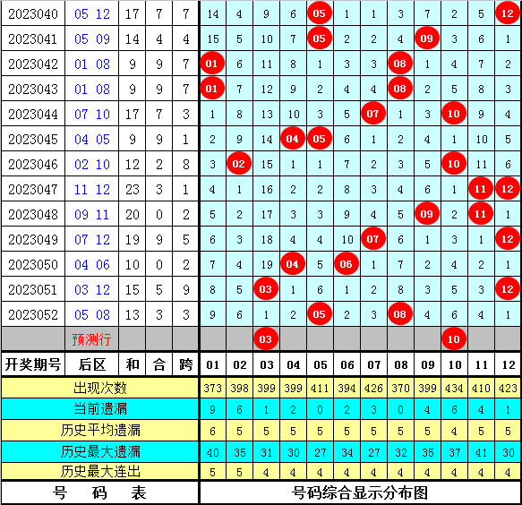 和值跨度:上期和值开出84,对比第2023051期和值下降了11个点位,本期预计和值在大号区域热出,看好出现在106周围。