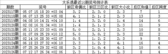 大乐透第2023126期开出奖号:07 12 17 26 34 + 02 06。其中前区号码三区比为2:1:2,奇偶比为2:3,大小比为2:3,后区开出全小、一奇一偶奖号。