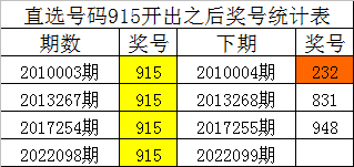 体彩排列三直选号码915历史上出现了4次,其下期分别开出奖号:232、831、948,统计如下表: