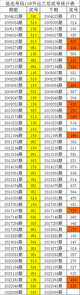 体彩排列三组选号码159历史上出现了45次,其下期奖号分别为:871、014、165、925、533、808、856、181、141、921、671、466、867、204、622、232、088、534、376、844、382、213、581、831、079、598、614、637、564、475、921、727、942、948、177、106、147、014、257、276、217、523、414、533,详细统计见下表: