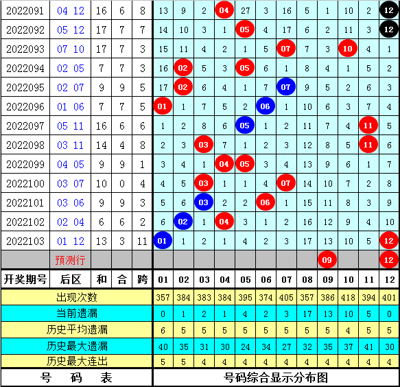 后区号码:上期开出一大一小组合,本期侧重大号,关注全大,参考号码:09 12。