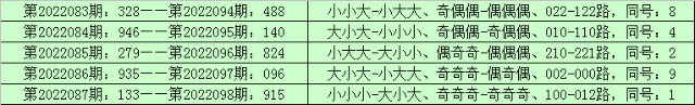 统计排列三已开出的奖号发现,在连续5期(第2022083期-第2022087)奖号为:328-946-279-935-133。