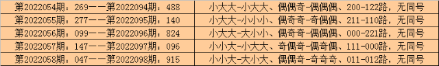 所以,排列三第2022059期奖号:592,与排列三第2022099期奖号可能没有同号。且排列三第2022099期奖号大小比、奇偶比和012路比不会与第2022059期奖号直选形态:大大小、奇奇偶和202路全部相同。