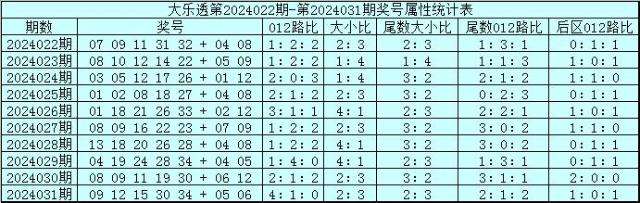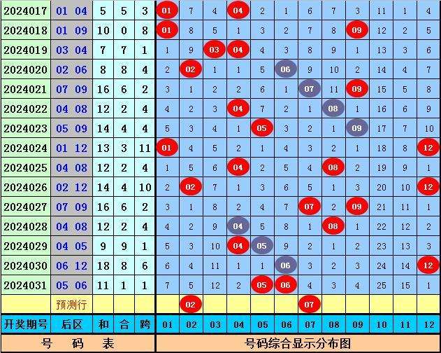 1、前区奖号012路分析:最近9期前区012路比为17:14:14,其中1路、2路分别轮空1次和2次,0路没有开出轮空现象,最近3期前区012路比为7:6:2,本期注意012路基本平衡,参考012路比1:2:2。