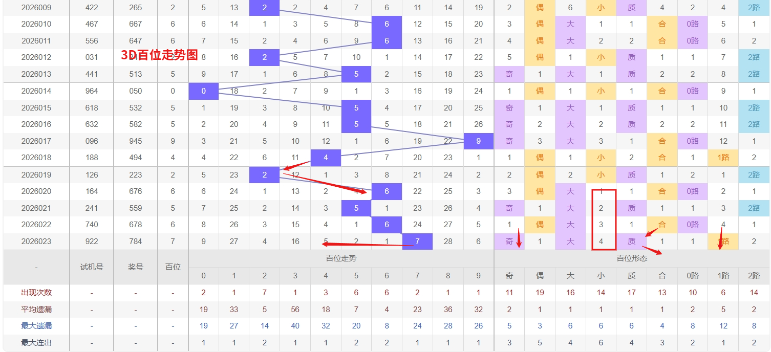 福彩3D百位分析:第2026023期百位开出号码7属于大奇数,从上面百位走势图上可以看出近100期大小比约为55:45奇偶比约为53:47。近期数据还是比较极端的符合文章开头介绍的求均衡规律非等量现象。但这种均衡不会持续最终会被偏态运行打破,然后循环往复。但短期内大小相差1点,小数过热大数有回补需求本期个人认为走大数的概率更高。上期百位落号“7”号球,在百位号码开出1路号码7后向大数方向走出1个振幅。那么通过分析上期百位落位号码分析,号码走出1个振幅,号码走为大奇数,开出1路号码7。通过对百位落号趋势来分析,百位号码落位后端,通过对近10期的走势来看百位号码大小交替频繁走3期大数又走2小数,3D百位近期走势分析,数字5表现出明确的强势,是近期值得重点关注的热号。热态数字通常具有惯性,短期内其热度有延续的可能。与此同时,数字8和9已进入较长的遗漏周期,呈现出明显的冷态特征。根据号码分布趋于平衡的规律,冷号在经历一段时间的沉寂后,其回补的势能和概率会显著增加。因此,在策略上应采取关注热号,防范冷号的布局,在追踪热号5的同时,对冷号8和9的潜在反弹保持高度警惕, 我们在百位关注的重点在03589这5个号码球上,百位号码近期奇偶切换频繁,7号球码属于1路号码奇数,现奇数开出过多有继续向奇数的趋势。所以福彩3D第2026024期百位看03589。