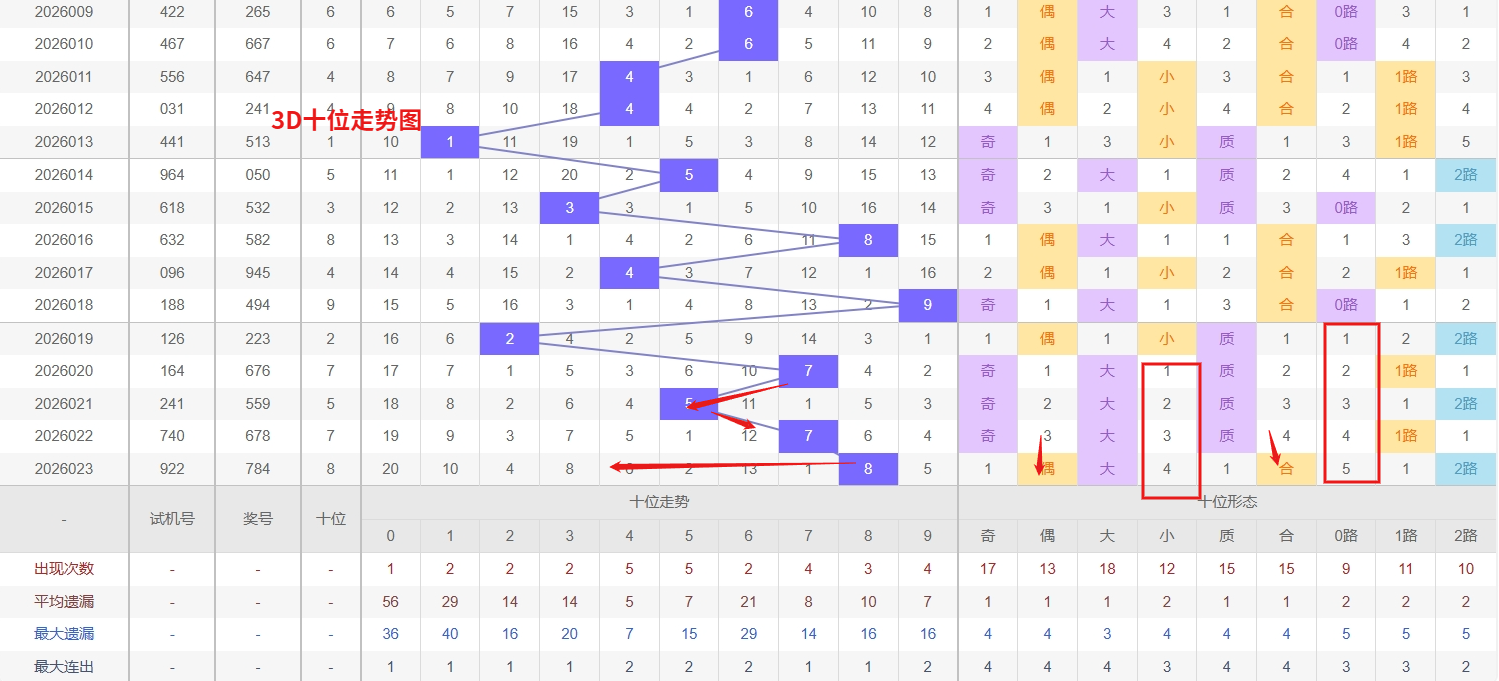 福彩3D十位分析:第2026023期十位开出号码8属大偶数号码后端。以历史100期数据为例十位奇偶比约为48比52,大小比约为55比45近期大小相差1点,根据求均衡的规律开出大数的概率比小数高一点。上期我们分析奇数经过连续回补后有走偶数的可能,开出奖号8大偶数符合我们的预期。3D十位近期走势分析,数字4表现活跃,呈现出明确的热态特征,其热度短期内延续的可能性较高,是需要重点防范的号码。与此同时,数字0已进入较长的遗漏周期,形成了显著的冷态。根据号码在长期走势中“冷热交替、趋向平衡”的客观规律,冷号随着遗漏值的不断累积,其回补的动能与概率也同步增强。所以福彩3D第2026024期十位推荐02459。