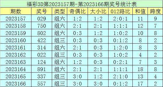 上期回顾:福彩3D第2023166期开奖号码为557,组选类型为组三,奇偶比为3:0,大小比为3:0。