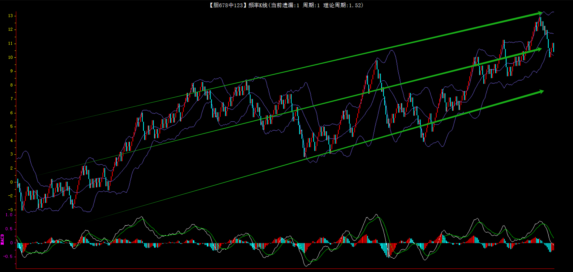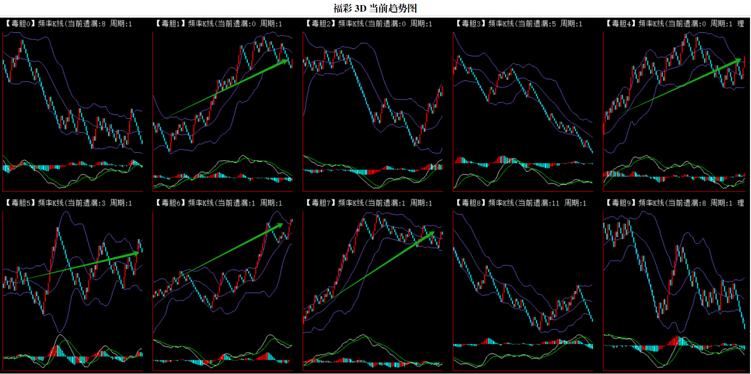 整体趋势上行,上边沿线趋势向上,下边沿趋势也是向上,节点震荡,当前遗漏1期,本期关注。