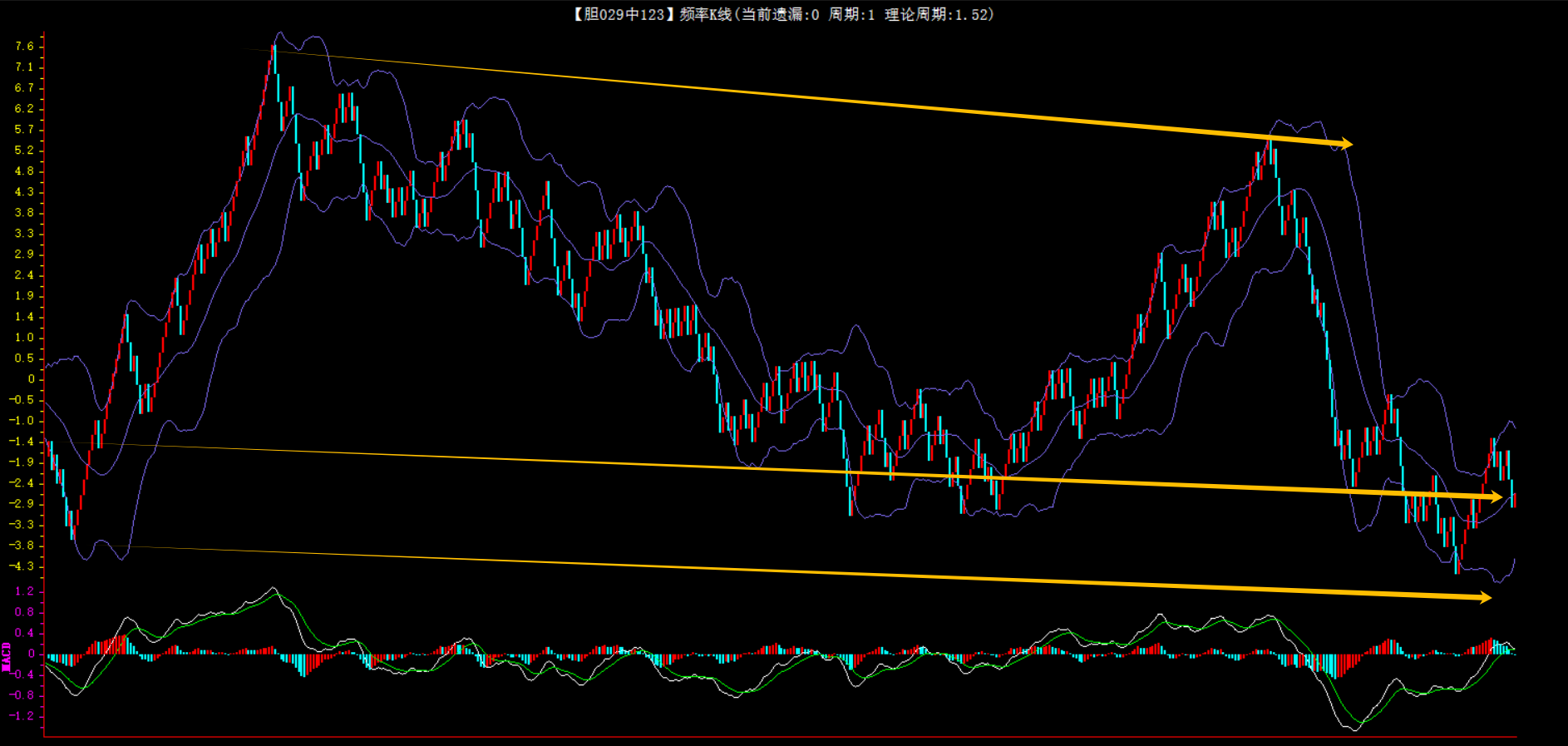 整体趋势下行,上边沿线趋势向下,下边沿趋势也是向下,节点震荡,当前开1期,本期防守。
