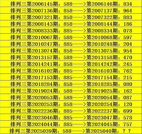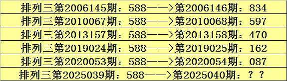 第2025039期排列三奖号为588,历史上该号码直选出现6次,下期奖号分别为:834、597、470、162、087。