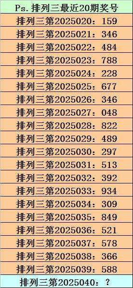 第2025039期排列三奖号为588,历史上该号码组选开出20次,下期奖号分别为:834、964、883、186、078、597、204、954、470、245、762、215、080、162、087、120、699、578、757。
