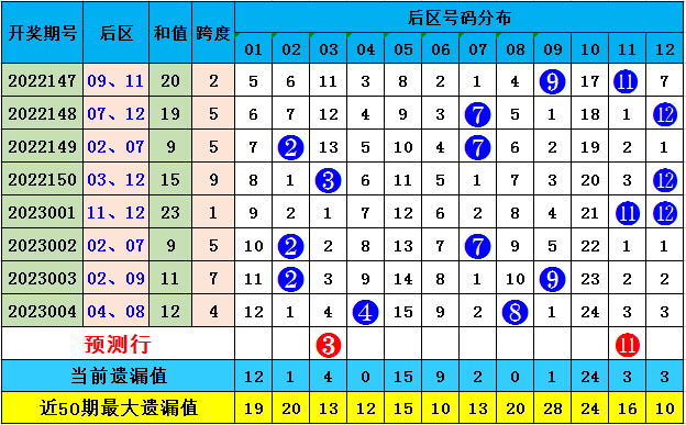 奇偶分析:最近8期后区奇数出现8次,偶数出现8次,近期奇偶数号码走势持平,本期关注奇奇组合。后区两码综合推荐:03、11。