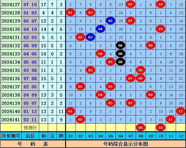 后区奖号分析:上期后区开出奖号02+11,奖号和值为13,跨度为9,本期后区注意和值走大,参考两码08 10。