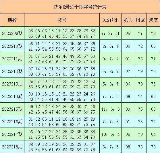 快乐8第2023218期奖号为:08 09 18 19 20 24 28 29 31 37 45 54 56 61 63 64 68 69 73 78,其中奖号012路比为8:7:5,0路号码(8个):09、18、24、45、54、63、69、78,1路号码(7个):19、28、31、37、61、64、73,2路号码(5个):08、20、29、56、68。