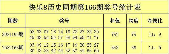 和值分析:历史同期第166期奖号和值出现范围在653-757之间,波动了104个点位,和值均值为705,去年同期和值开出653,下降了104个点位,对比去年同期和值,今年第166期预计和值逐渐上升,看好出现在40附近。