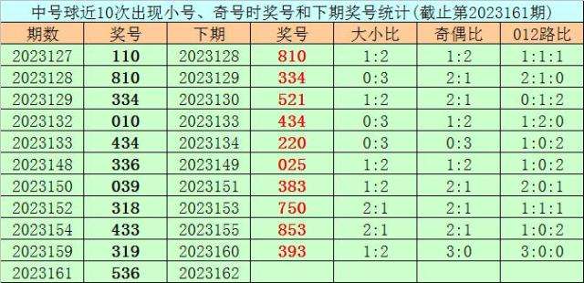 中号球:上期奖号为3,开出小号、奇号,该位前10次开出小号、奇号的现象时其奖号分别为:110、810、334、010、434、336、039、318、433、319,其中中号球012路比为5:5:0。