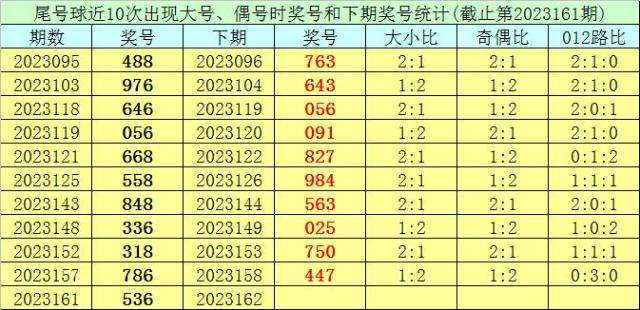 在尾号球前10次开出大号、偶号类型之后,其下期分别开出奖号:763、643、056、091、827、984、563、025、750、447,其中号码012路比为5:4:1,奇偶比为7:3,大小比为4:6。