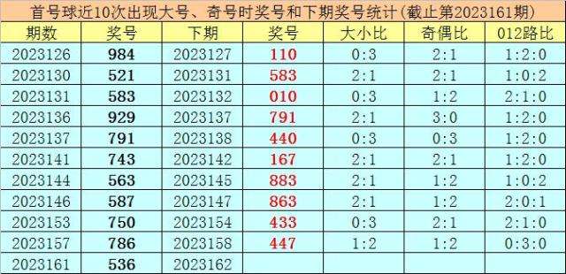 在首号球前10次开出大号、奇号类型之后,其下期分别开出奖号:110、583、010、791、440、167、883、863、433、447,其中号码奇偶比为4:6,大小比为4:6,012路比为1:6:3。