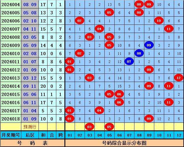 后区上期开出奖号01和09,该组合历史上出现了29次,其下期奖号频次分别为:号码10出现10次,02、05、08、09出现6次,03、07、12出现5次,04、11出现3次,01出现1次,06出现0次,本期后区参考号码01、03、05、11,精选两码03和05。