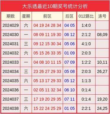 开奖回顾:大乐透2024038开奖号码为15、22、24、25、29+01、05。其中012路比为2:2:1、开出1组连号24,25。