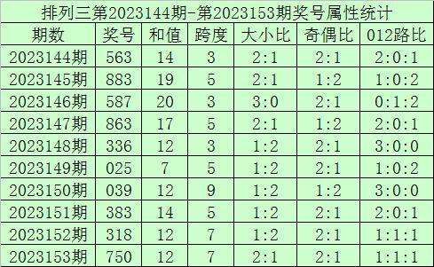 上期回顾:排列三第2023153期开奖号:750,奖号和值:12,奇偶比2:1,大小比2:1。