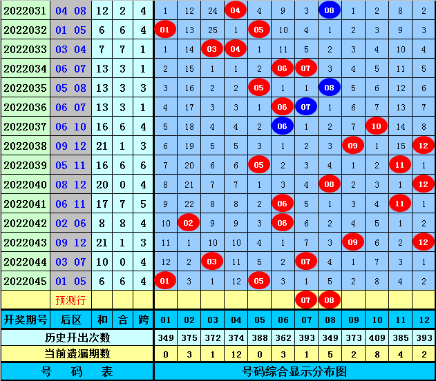 后区分析:上期后区奖号为01和05遗漏期数分别为12期和5期,目前后区遗漏5期以内的热码有9个:01、02、03、05、06、07、09、11、12,遗漏4期以上的热码有3个,本期后区注意冷热号码同时开出,看好两码07、08。