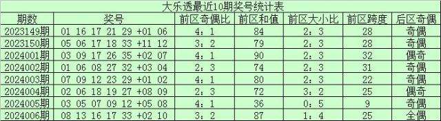 大乐透第24006期奖号为:08、13、16、17、33+02、10。其中前区和值为87,奇偶比为3:2,大小比为1:4。后区为一大一小、全偶组合。