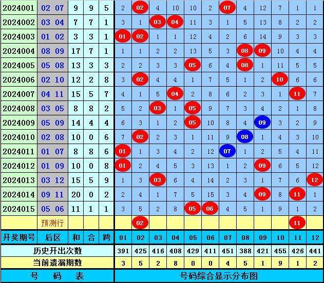 后区分析(定义:01-04为一区,05-08为二区,09-12为三区):上期后区开出奖号05和06,全在第二区出现,最近10期后区三个区间落号个数比为7:6:7,本期后区注意第一区和第三区号码出现,关注两码02、11。