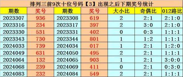 上期回顾:排列三2024093期奖号为935,号码类型:组六,奇偶比3:0,大小比2:1,012路比2:0:1。