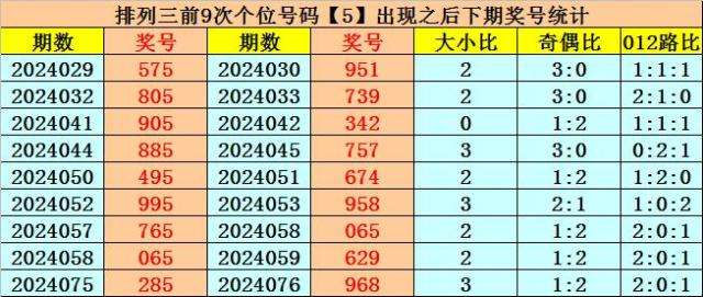 个位号码:上期奖号为大号、奇数、2路号码:5,历史上个位号码5共开出661期,前一次出现在第2024075期,上期遗漏17期再出。