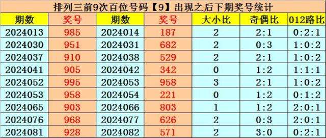 百位号码:百位上期奖号为0路、奇数、大号:9,历史上百位号码9共开出688期,前一次开出期数在第2024081期,上期奖号隔11期再次开出。