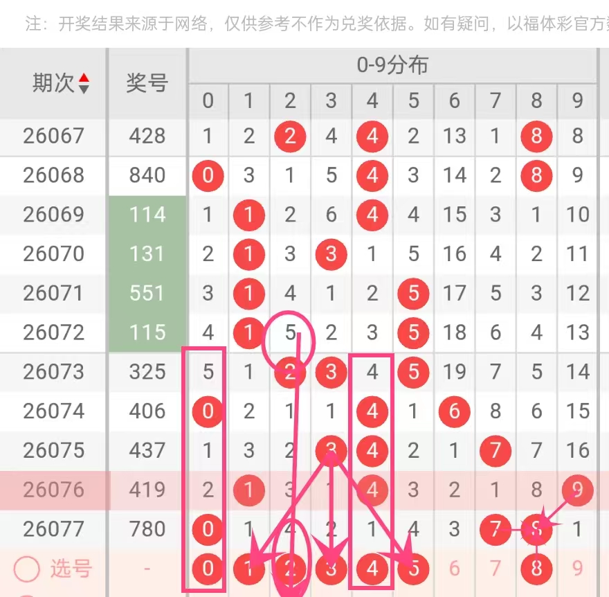理由:从“冷号反弹”角度分析,0在近5期中仅出现一次(2026077期个位),但在此之前曾有较长时间未露面,属于典型的中期冷号。在排列三中,冷号往往在回补后出现短期连出或隔期再现的情况。结合“大小分布”,0作为最小号,在整体号码向两端扩散的背景下,具备继续出现的条件,尤其是其在个位形成“回马枪”走势。