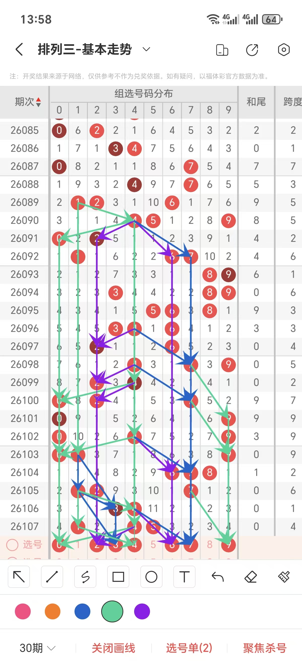 上期推荐12路,两码差1(45),两奇组合,两小组合的条件正确,单挑双胆15组合命中,小车中组选。