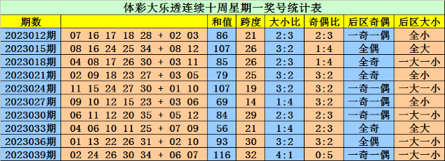 前区大小比推荐:最近10周星期一前区大小奖号总比例为24:26,其中有5期大号热出,有5期小号热出,大小号码出号比例相当,最近3周星期一奖号大小比分别为1:4、3:2、4:1,本周星期一适当关注小号热出,参考大小比2:3。