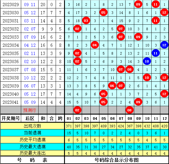 后区分析:最近10周星期一后区号码奇偶比为11:9,奇偶号码走势基本持平,号码大小比为9:11,大小号码开出比例基本持平,本期后区精选两码02和08。