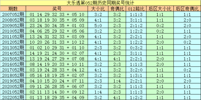 奇偶比判断:在第052期历史同期奖号中,号码奇偶比分别出现3:2、3:2、2:3、2:3、3:2、2:3、3:2、2:3、4:1、2:3、3:2、3:2、1:4、3:2、2:3、4:1,奇偶号码开出个数总比例为42:38,偶数号码总体开出比例较低,今年第052期同期看好偶数号码反弹,预计开出奇偶比2:3。
