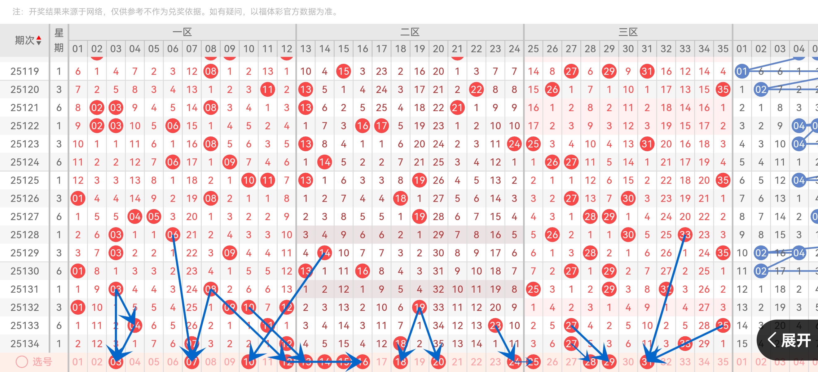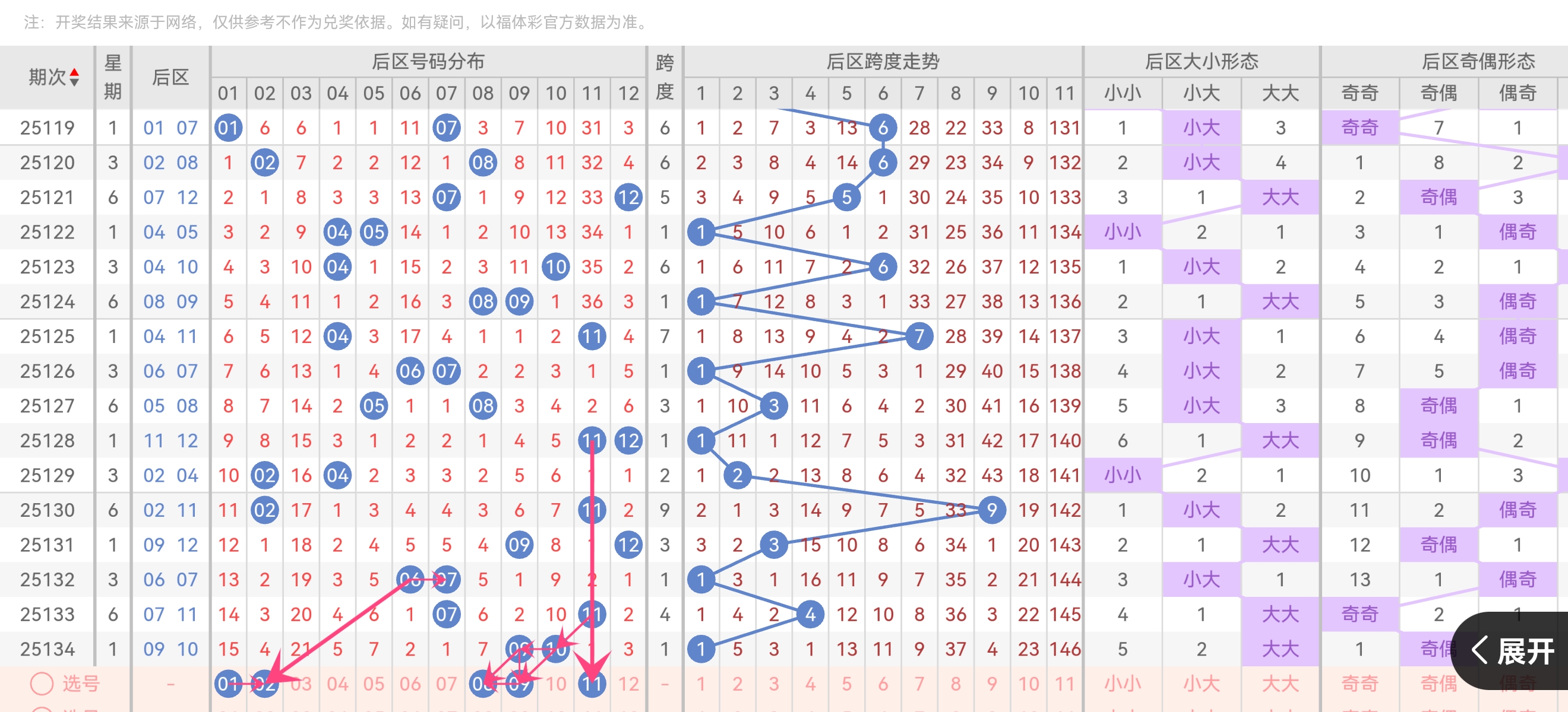 后区重号 :近两期(25133和25134)均未开后区重号。根据热势消退后维持低温。本期预测不会开出重号。