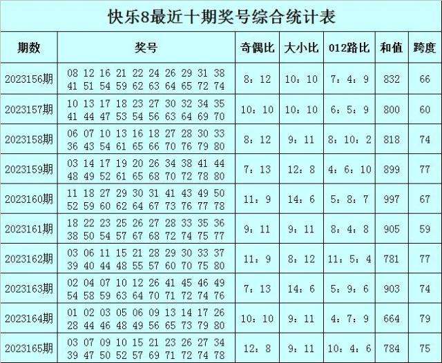 福彩快乐8第2023165期开出奖号:03 07 09 10 15 21 23 26 27 34 39 47 50 52 57 69 71 72 74 78,其中奖号奇偶比开出12:8,大小比开出9:11,和值开出784,跨度开出75,012路比开出10:4:6。