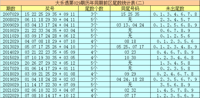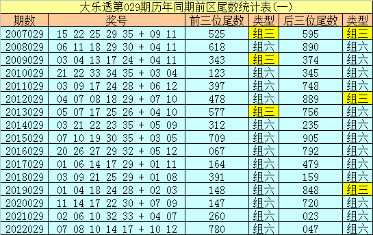 在大乐透第029期历年同期奖号中,前区后三位尾数出号频次分别为:尾数5、7、9出现7个,尾数4、8出现6个,尾数0出现5个,尾数2、3出现4个,尾数1、6出现1个。其中尾数数字三类型豹子、组三、组六次数比为0:3:13,今年同期后三位尾数类型参考组六;
