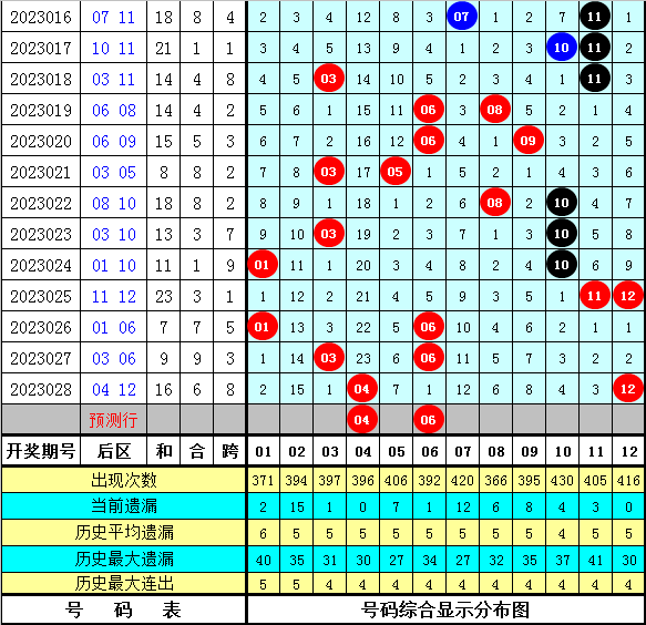 大乐透历年同期第029期后区尾数奇偶比为18:14,最近5年尾数奇偶比为5:5,后区尾数大小比为11:21,最近5年尾数大小比为4:6,本期后区注意号码04、06、09、10、11,后区两码关注04、06。