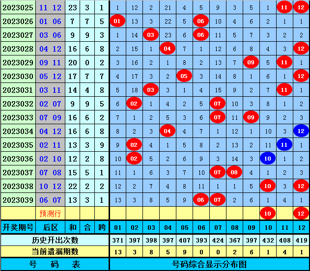 后区分析:上期后区开出遗漏11期和1期的奖号06和07,最近10期后区冷温热码(遗漏期数大于9期为冷码,遗漏4-9期之间为温码,遗漏0-3期为热码)出现个数比为5:2:13,目前后区号码遗漏期数分别为:号码06、07遗漏0期,号码10、12遗漏1期,号码08遗漏2期,号码02遗漏3期,号码11遗漏4期,号码04遗漏5期,号码09遗漏6期,号码03遗漏8期,号码05遗漏9期,号码01遗漏13期,本期后区参考号码03、05、10、11、12,精选两码10、12。