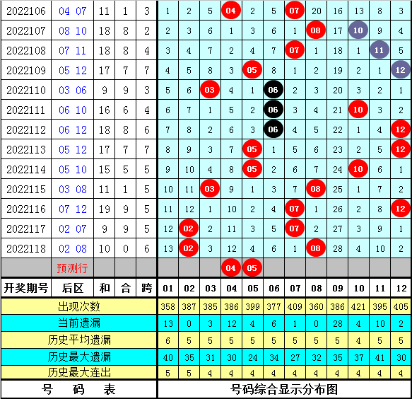 后区分析:上期开出奖号:02+08,目前后区包含冷温热码个数比为4:3:5,本期后区重点关注温码和冷码奖号出现,参考两码04+05。